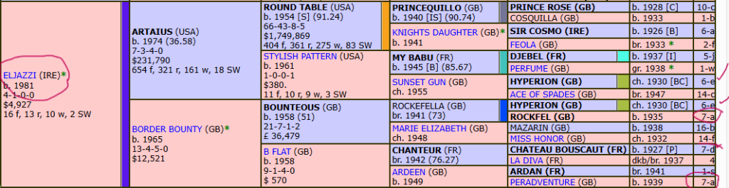 The pedigree indicates linebreeding @ 19x Hyperion, noted direct to Eljazzi + 5×4 Nureyev thence dam Special 6 x8x5 @Sadlers Wells sighted to 4th dam sire, I Am Immortal (Aus).